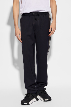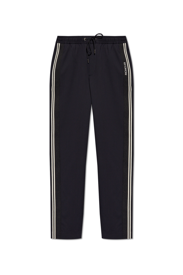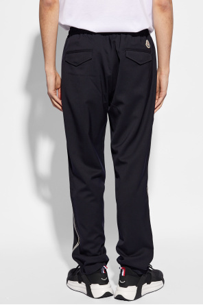Navy blue trousers from Moncler. Enriched by a colourful logo patch on the back, this pair employs a drawstring waist, two front slip pockets, two back flapped pockets with snaps and slightly tapered legs with black and white side panels featuring an embroidered logo.