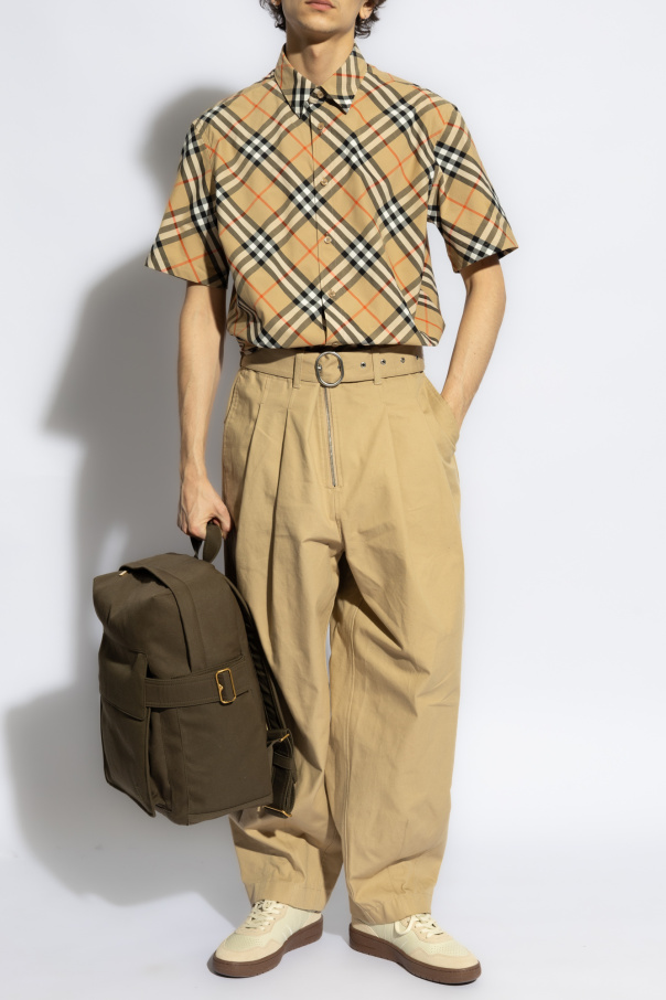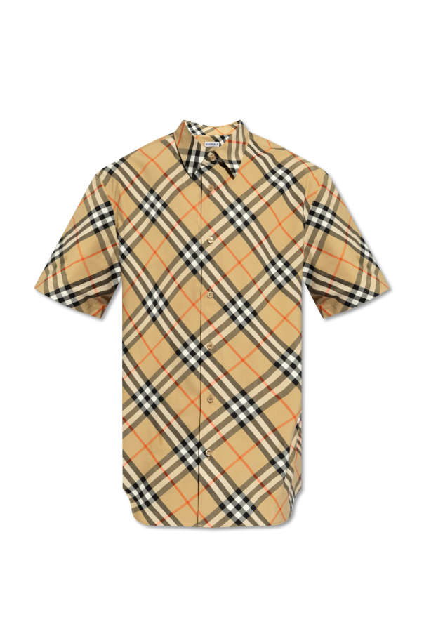 Beige, black and red shirt from Burberry. Made from cotton, this style showcases the brand's signature check motif, button fastenings and short sleeves.