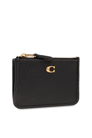 Purple card case from Coach. Made of grained leather, this item showcases a logo-shaped application on the front, one zip pocket with a keyring and chain inside, gold-tone metal hardware and three card slots.