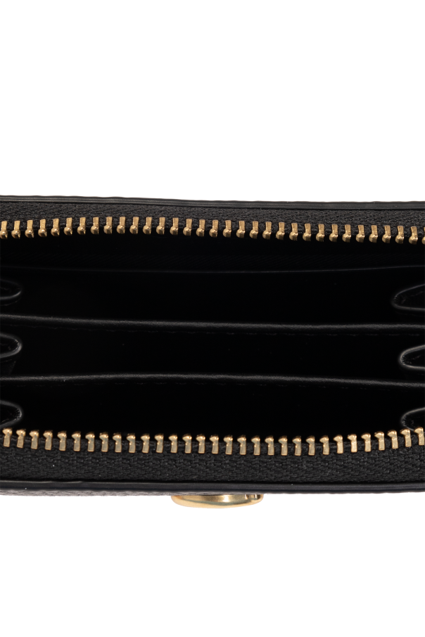 Black card case from Coach. Made of leather, this item fastens via a zip and showcases a logo-shaped application on the front, one card slot on the back, gold-tone metal hardware as well as an interior with three pockets and two card slots.