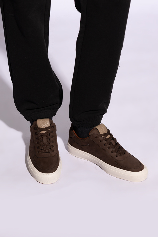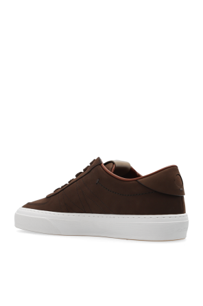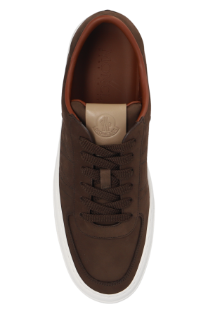 Dark brown ‘Monclub’ sneakers from Moncler. Made of suede, this lace-up model sits on a beige and white rubber sole and showcases the brand's logo and a brown interior.
