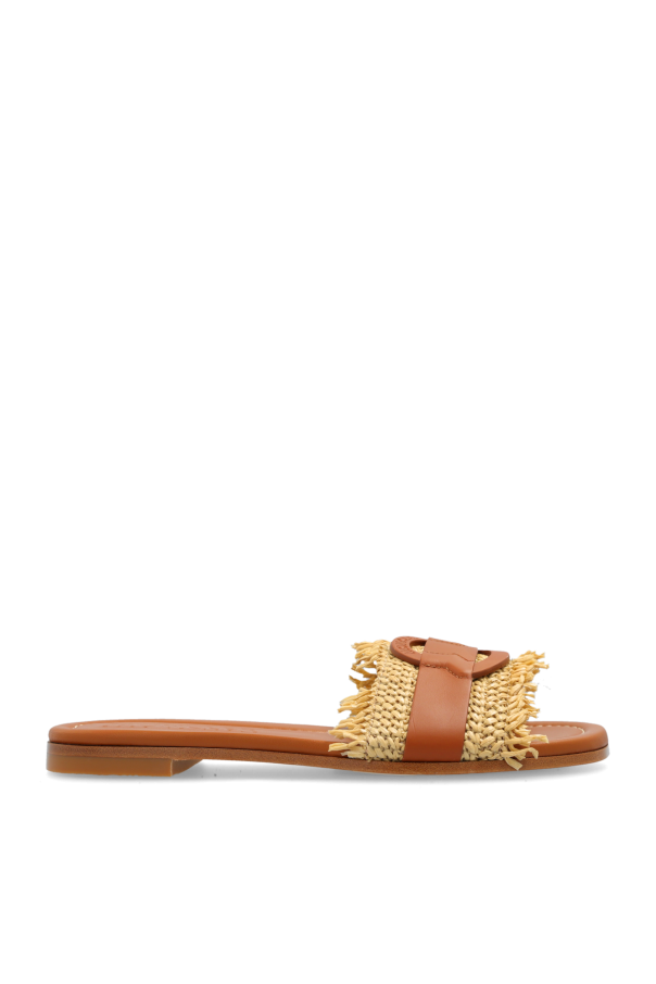 Brown and light beige ‘Bell’ slides from Moncler. Made of smooth leather, this model sits on a beige leather sole with rubber trim and showcases a logo-shaped application and braided rope detailing.