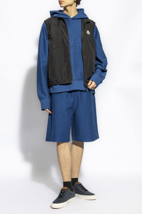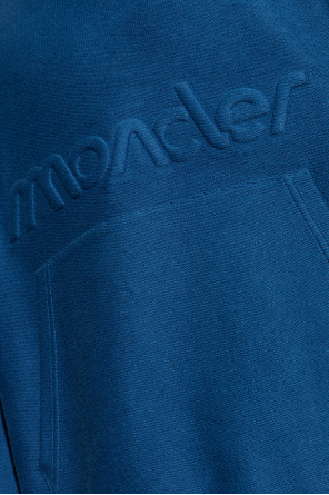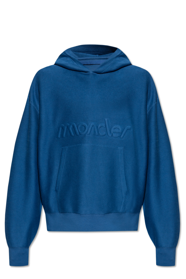 Blue hoodie from Moncler. Made of cotton with a relaxed fit, this style showcases a kangaroo pocket accompanied by a tactile logo on the front and ribbed trims on the bottom hem and cuffs.
