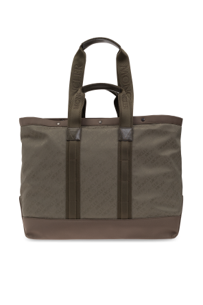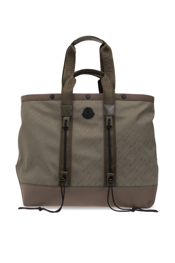 Green shopper bag from Moncler. Made from monogrammed material and trimmed with leather, this design fastens via snaps and showcases a rubber logo patch and black drawstrings on the front, two half-round handles and straps and one internal compartment with one zip pocket and three slip pockets.