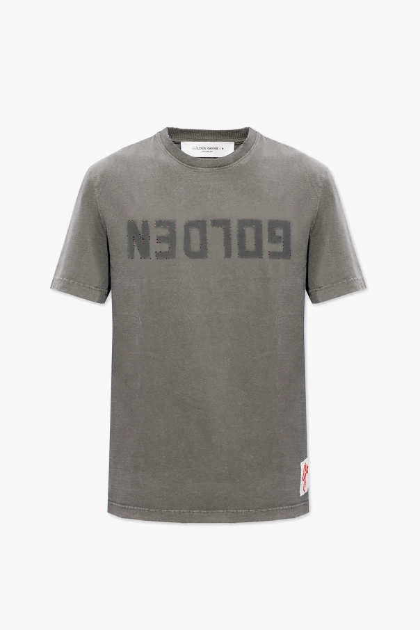 Golden Goose 复古效果灰绿色T恤,采用棉质制成,饰以徽标、红色字母刺绣的品牌标志性贴片、背面标志性的金属星星贴花、罗纹圆领和短袖。