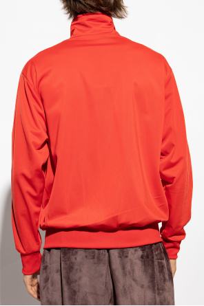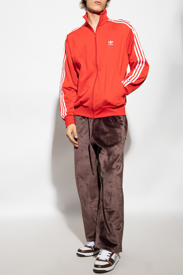 ADIDAS Originals的红色运动衫,采用再生面料制成,拉链开合,绣有白色徽标,品牌标志性三条纹,正面有两个拉链口袋,长袖配有罗纹饰边。