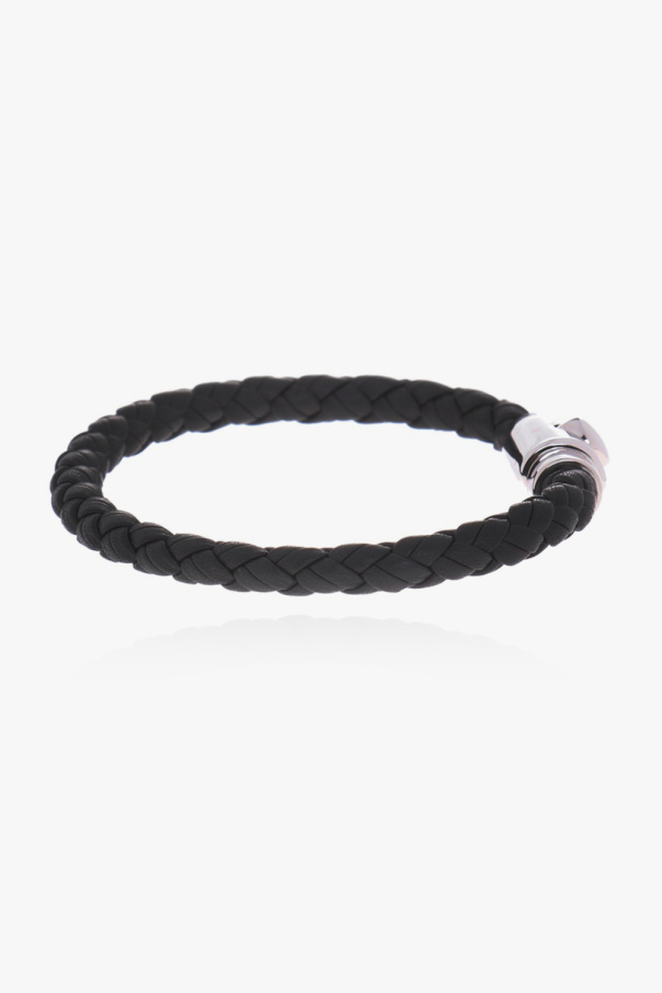 Salvatore Ferragamo的黑色编织手镯。牛皮革制成。饰有含银色logo的装饰扣。