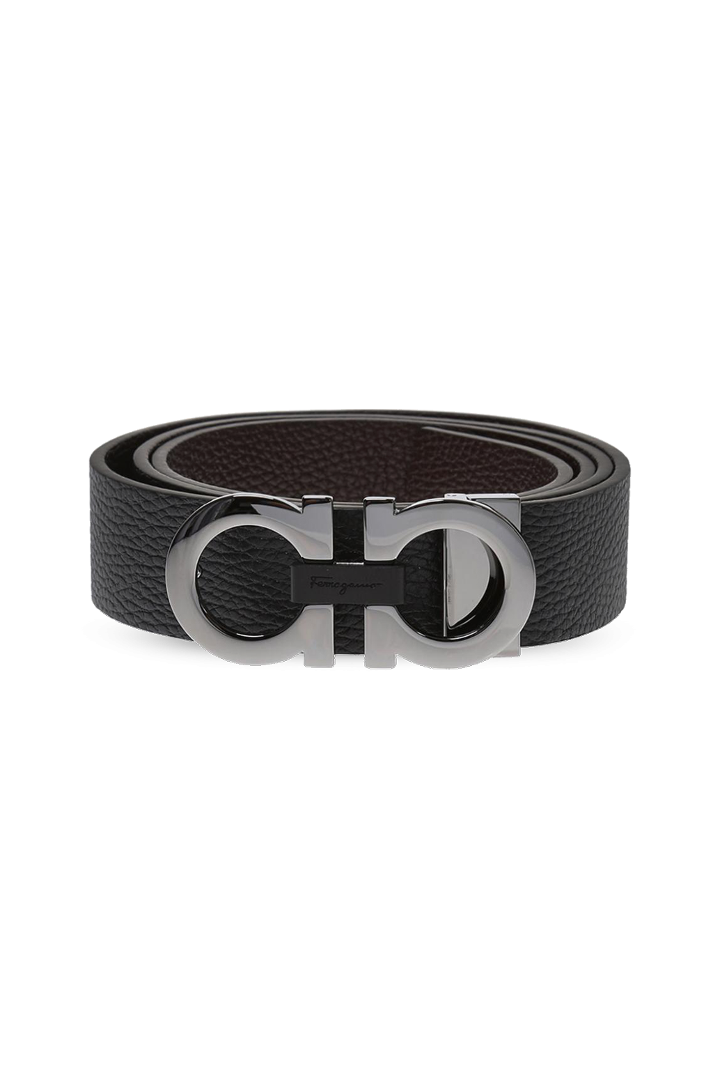 Black and brown reversible belt from Salvatore Ferragamo. Made of grain leather. Grey metal buckle with logo.