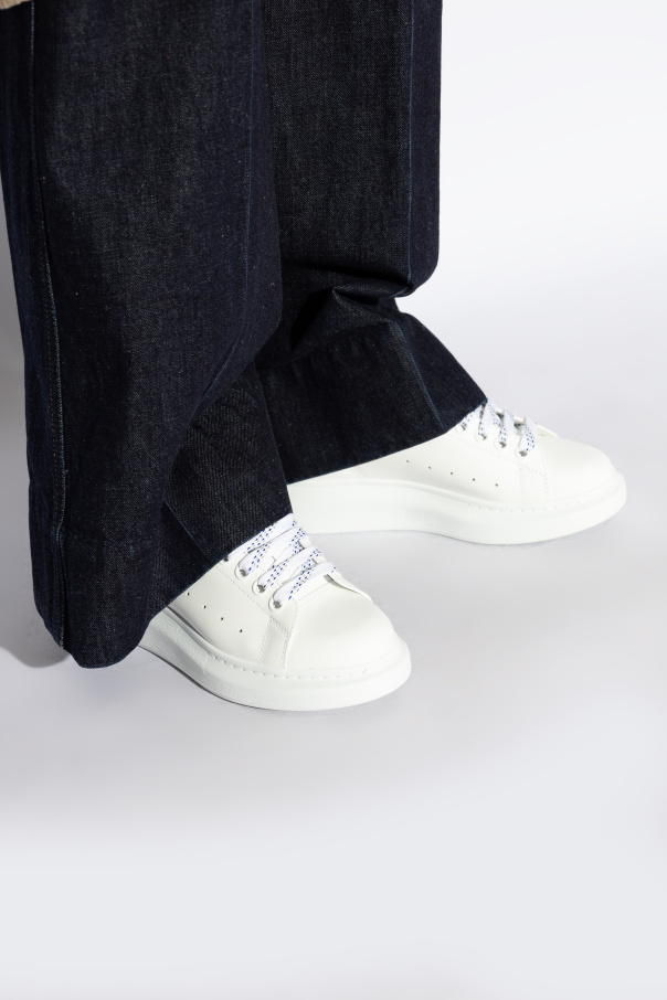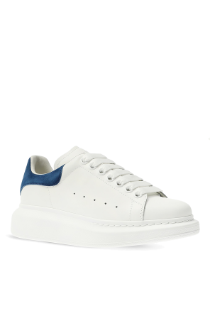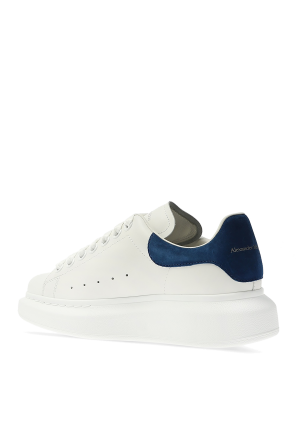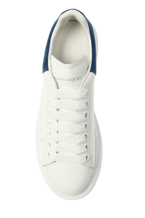 Alexander McQueen的白蓝色真皮系带运动鞋,侧直穿孔式细节。鞋舌与后面饰以印花logo。蓝色麂皮元素。白色橡胶鞋底。