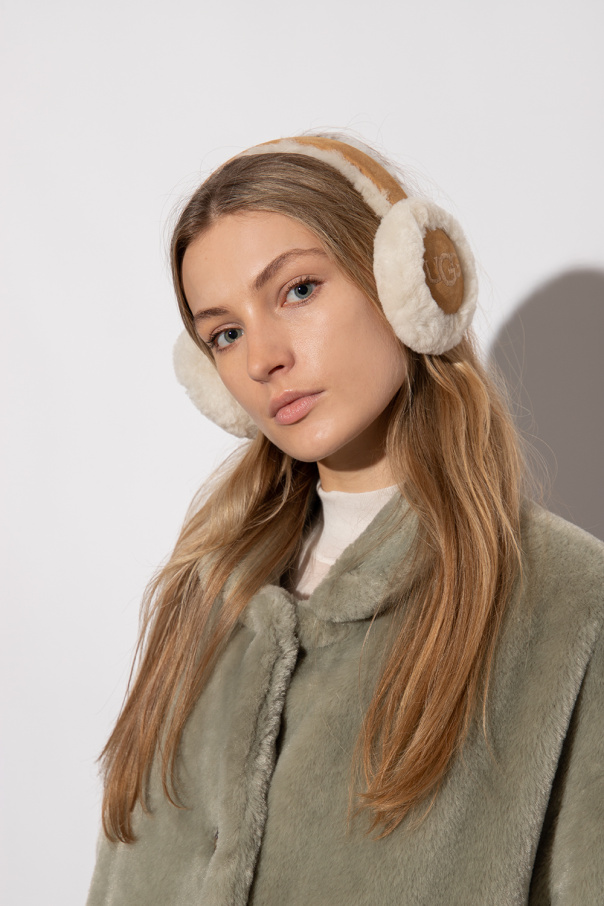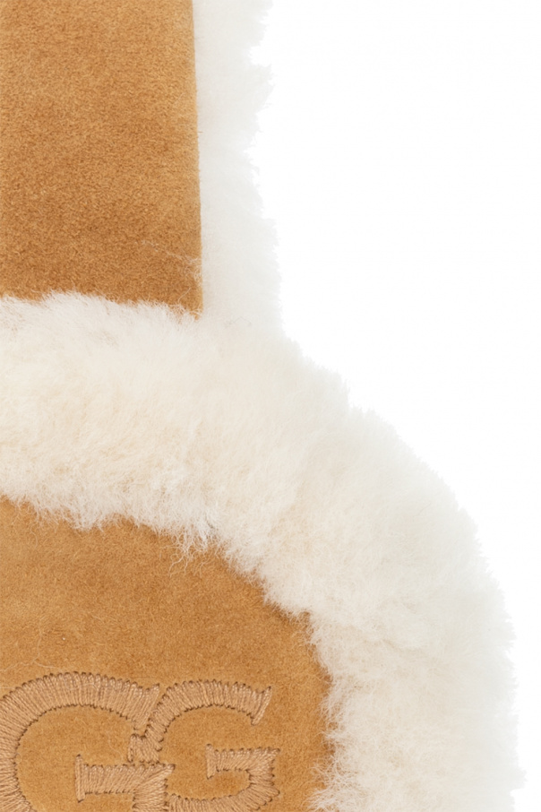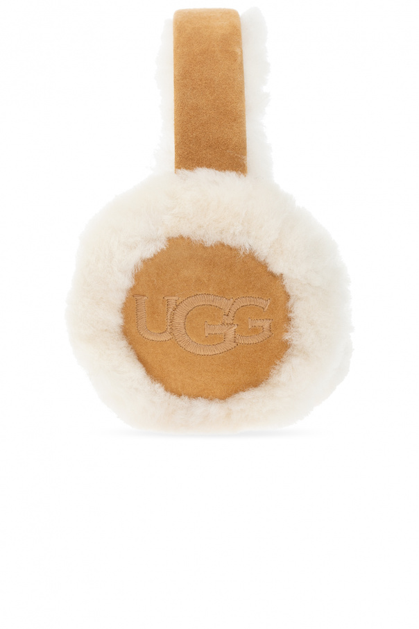 Beige and brown earmuffs from UGG. Crafted from suede and finished with sheep fur, this item showcases an embroidered logo.