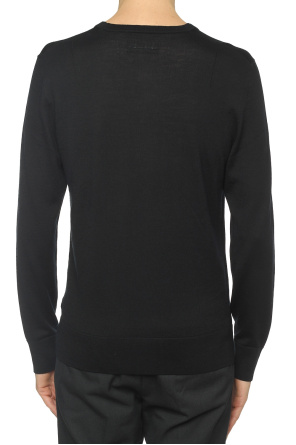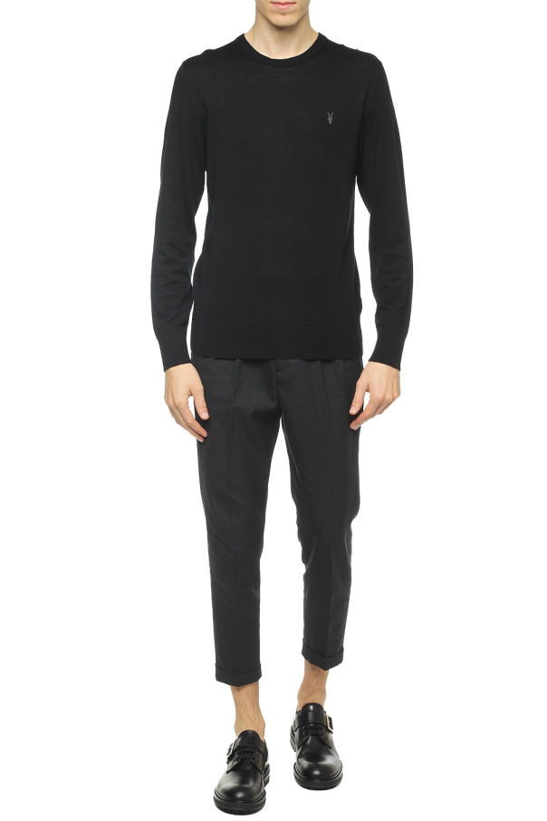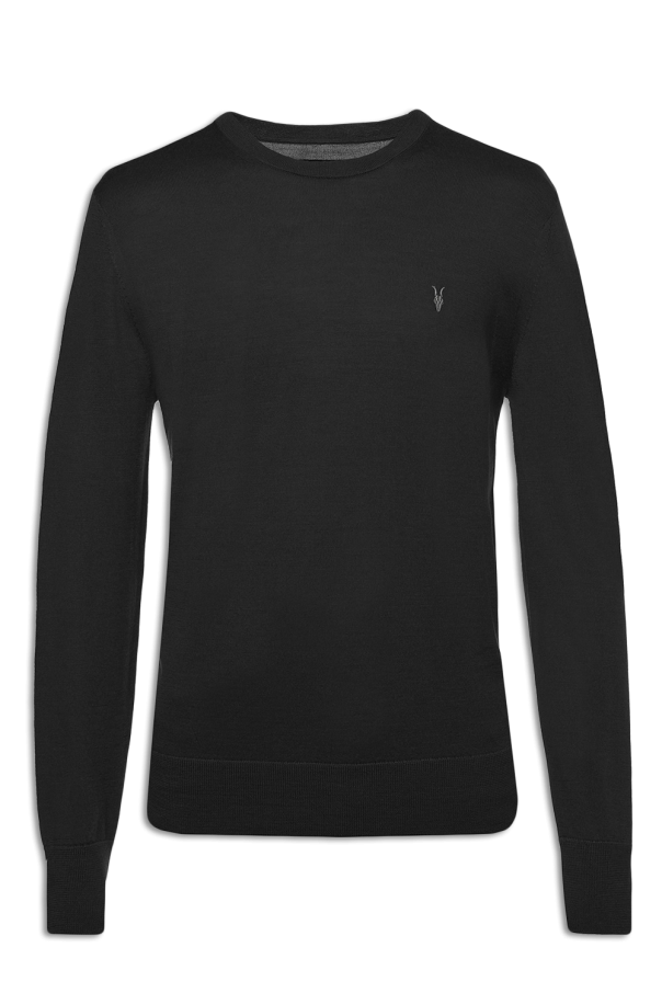 AllSaints的黑色Mode毛衣。美利奴羊毛制成。正面饰有灰色logo绣花。圆领。弹性领,下摆和袖口。