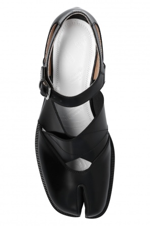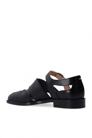 Maison Margiela的黑色皮质鞋,搭扣踝带,饰以挖剪细节。米黑色皮质鞋底。